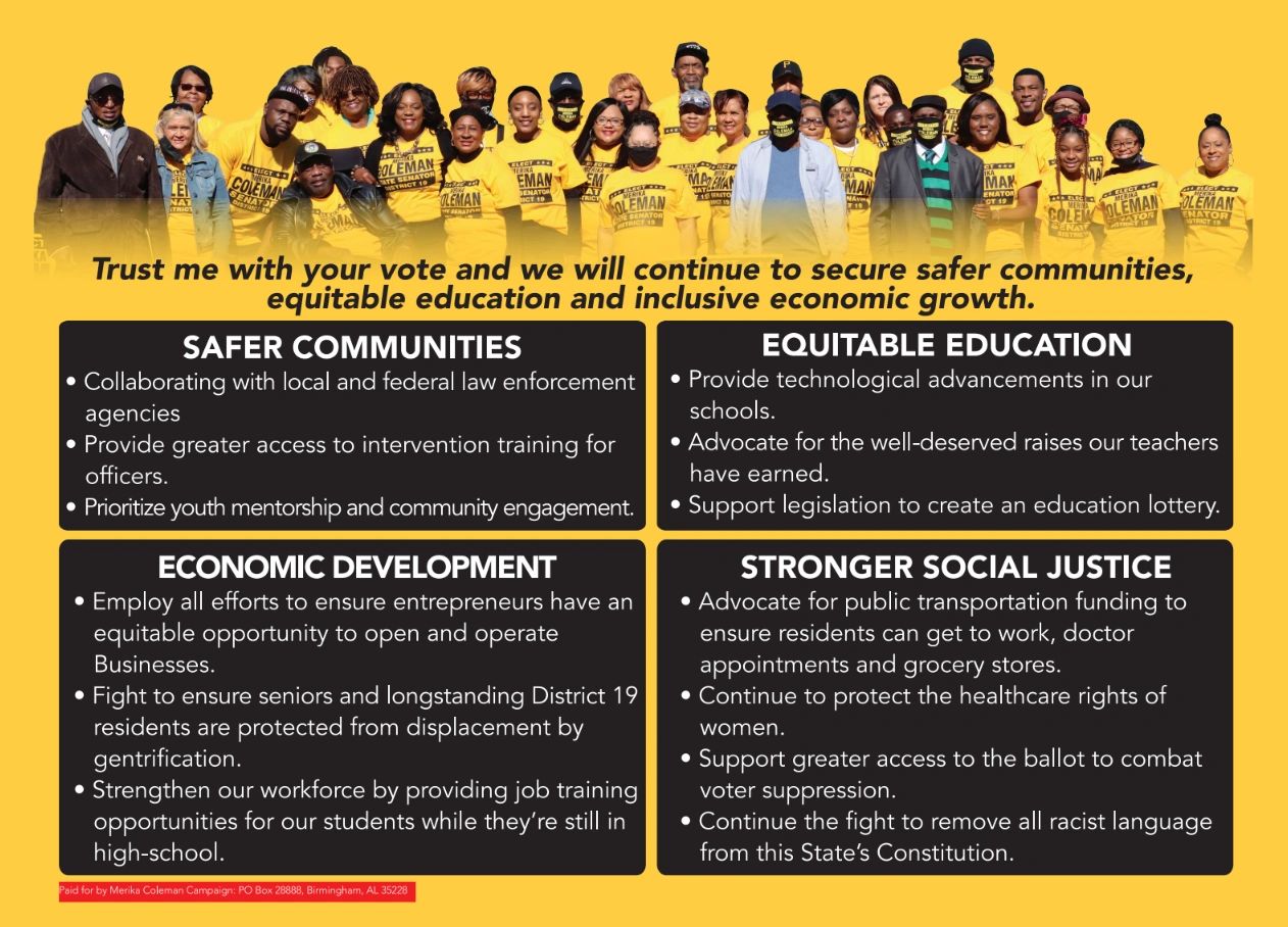 With over 20 years of experience in the Alabama State Legislature—including two decades in the Alabama House of Representatives—Merika Coleman has proven herself a dedicated public servant, a principled leader, and a tireless advocate for the people of Alabama.